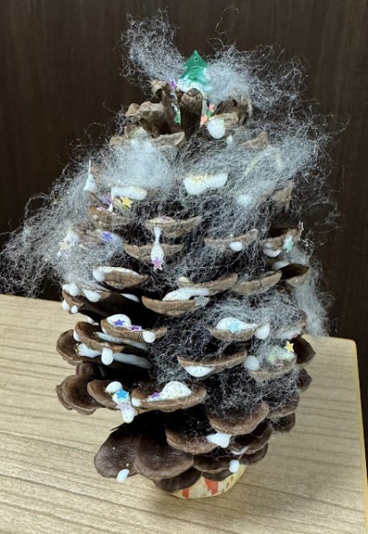 大松ぼっくりツリー作成 2024/12/11(水) おはようございます。昨日、大松ぼっくりツリーを作成してもらいました。キラキラの粉や星、綿(雪)など、上手に指先でつまんでパラパラとふりいかけていました。また綿もちぎって雪が積もっているように工夫して完成できました!これからもどんな大松ぼっくりツリーが出来上がるのか楽しみです!おわり お知らせ一覧