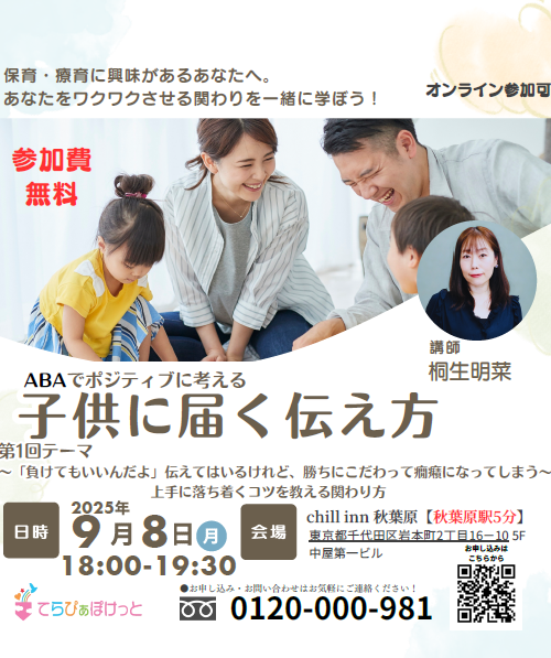 ABAでポジティブに考える 子供に届く伝え方 2025/08/21(木) こんにちは。タイトルのオンライン講座が、9月8日(月)18時~19時30分に開催されます(会場は秋葉原です)。事前申し込み制で、ご興味のある全ての方が無料で参加できます。第1回のテーマは、~「負けてもいいんだよ」伝えてはいるけれど、勝ちにこだわって 癇癪になってしまう~ 上手に落ち着くコツを教える関わり方申し込みはファイルをご参照ください。おわり お知らせ一覧